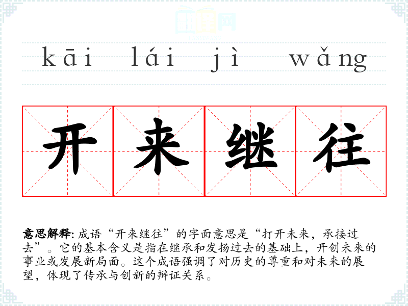 成语“开来继往”的字面意思是“打开未来,承接过去”。它的基本含义是指在继承和发扬过去的基础上,开创未来的事业或发展新局面。这个成语强调了对历史的尊重和对未来的展望,体现了传承与创新的辩证关系。