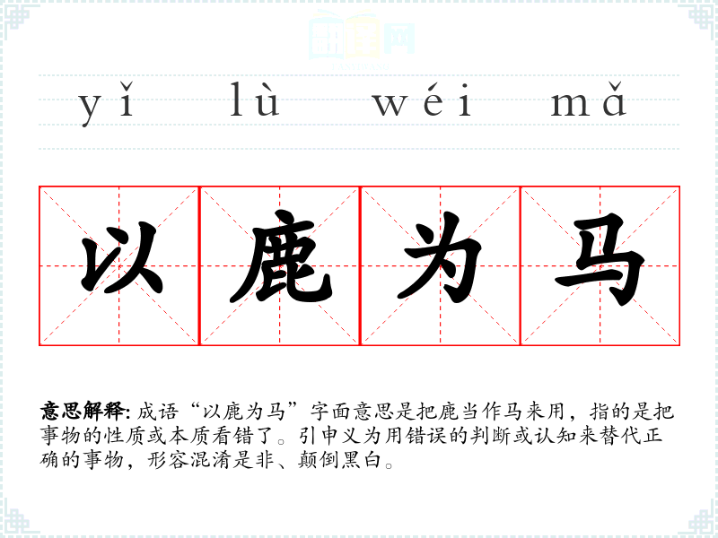 成语“以鹿为马”字面意思是把鹿当作马来用,指的是把事物的性质或本质看错了。引申义为用错误的判断或认知来替代正确的事物,形容混淆是非、颠倒黑白。