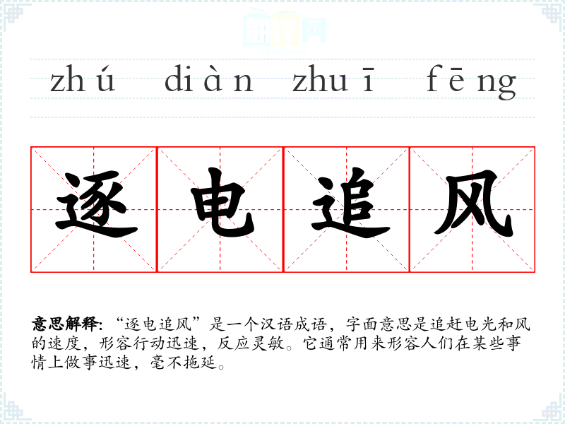 “逐电追风”是一个汉语成语,字面意思是追赶电光和风的速度,形容行动迅速,反应灵敏。它通常用来形容人们在某些事情上做事迅速,毫不拖延。