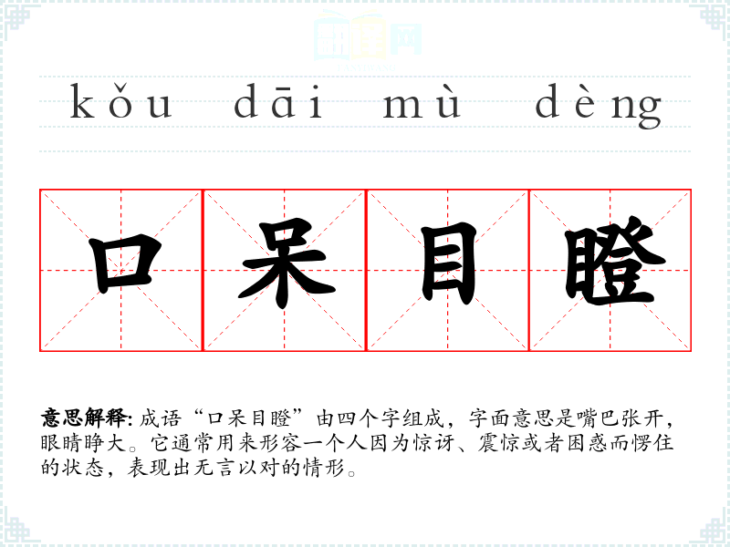 成语“口呆目瞪”由四个字组成,字面意思是嘴巴张开,眼睛睁大。它通常用来形容一个人因为惊讶、震惊或者困惑而愣住的状态,表现出无言以对的情形。