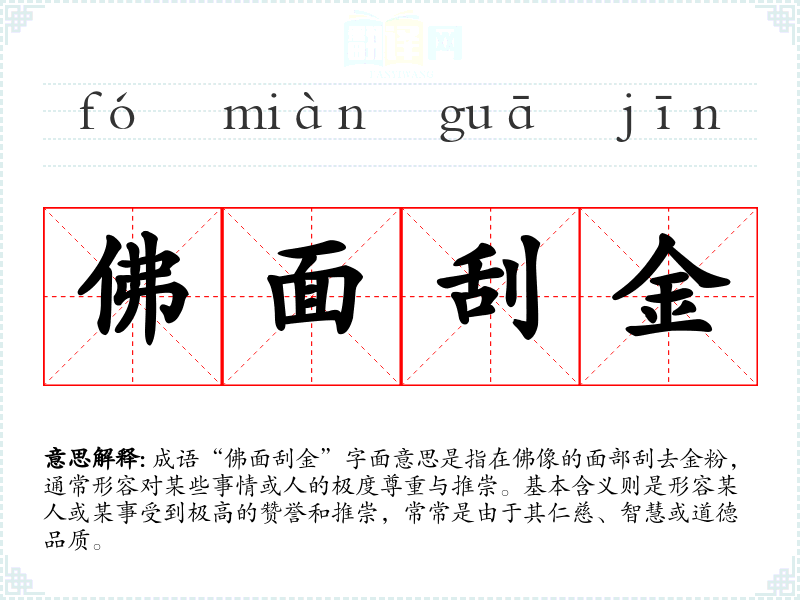 成语“佛面刮金”字面意思是指在佛像的面部刮去金粉,通常形容对某些事情或人的极度尊重与推崇。基本含义则是形容某人或某事受到极高的赞誉和推崇,常常是由于其仁慈、智慧或道德品质。