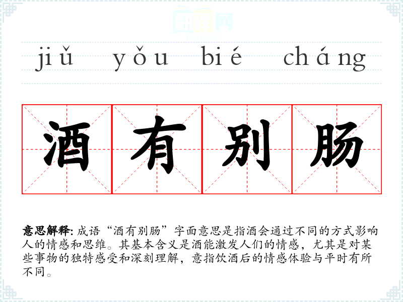 成语“酒有别肠”字面意思是指酒会通过不同的方式影响人的情感和思维。其基本含义是酒能激发人们的情感,尤其是对某些事物的独特感受和深刻理解,意指饮酒后的情感体验与平时有所不同。