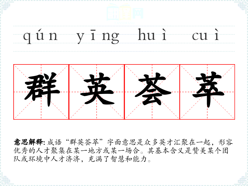 成语“群英荟萃”字面意思是众多英才汇聚在一起,形容优秀的人才聚集在某一地方或某一场合。其基本含义是赞美某个团队或环境中人才济济,充满了智慧和能力。