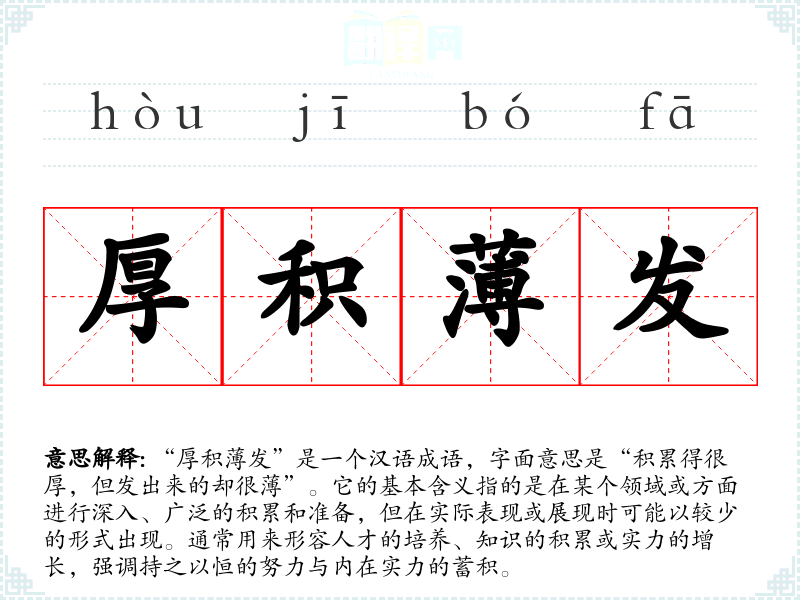 “厚积发”源自于《老子》中的“有之以为利,无之以为用”,意在强调内在的积累和外在的表现之间的关系。成语的具体出现在近现代的文学作品中,逐渐被广泛使用,成为一种鼓励人们在学和工作中注重内涵和实质的表达。