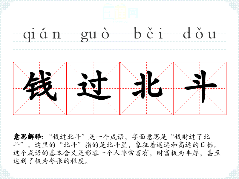 “钱过北斗”的具体来源并没有明确的历史典故,但从字面意思看,它可以解读为一种夸张的表达方式,常用于形容一个人财富的极度丰富。这种夸张的表达在**传统文化中较为常见,常见于文学作品和民间故事,旨在强调财富的重要性或是人们对财富的渴望。
