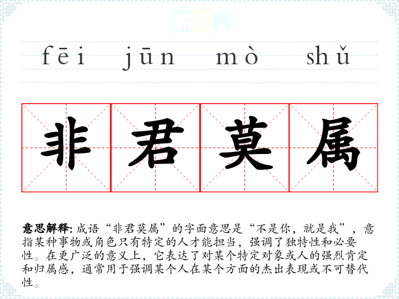 - 文学作品:在古典文学中,常用于描述英雄人物或领袖的独特性,比如在描写某位领袖时,常说“非君莫属”来强调其担当的责任和能力。