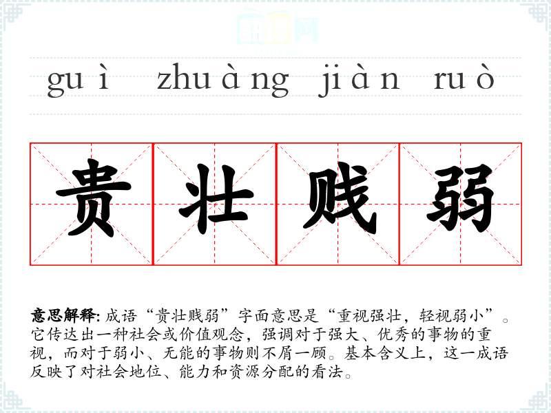 成语“贵壮贱弱”字面意思是“重视强壮,轻视弱小”。它传达出一种社会或价值观念,强调对于强大、优秀的事物的重视,而对于弱小、无能的事物则不屑一顾。基本含义上,这一成语反映了对社会地位、能力和资源分配的看法。