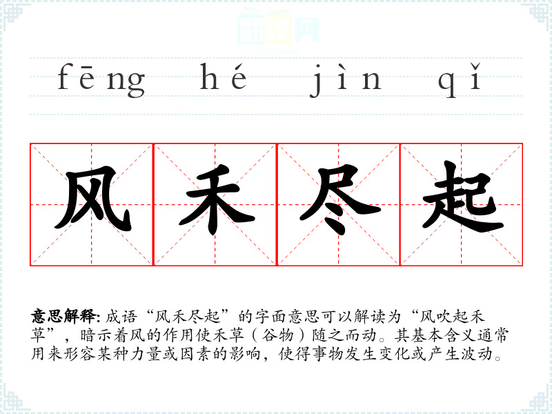 成语“风禾尽起”的字面意思可以解读为“风吹起禾草”,暗示着风的作用使禾草(谷物)随之而动。其基本含义通常用来形容某种力量或因素的影响,使得事物发生变化或产生波动。