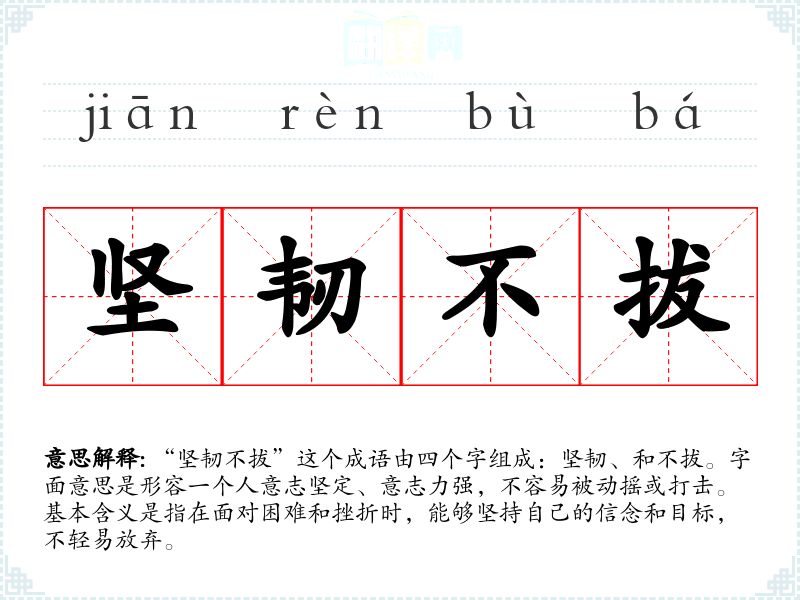 “坚韧不拔”这个成语由四个字组成:坚韧、和不拔。字面意思是形容一个人意志坚定、意志力强,不容易被动摇或打击。基本含义是指在面对困难和挫折时,能够坚持自己的信念和目标,不轻易放弃。