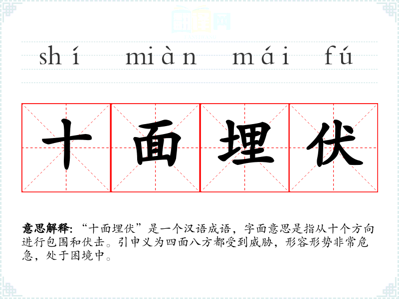 “十面埋伏”是一个汉语成语,字面意思是指从十个方向进行包围和伏击。引申义为四面八方都受到威胁,形容形势非常危急,处于困境中。