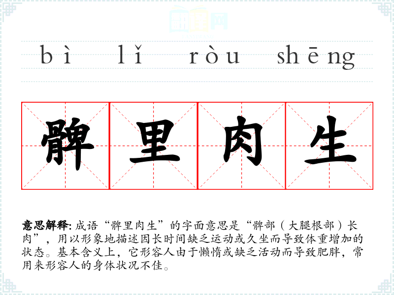 成语“髀里肉生”的字面意思是“髀部(大腿根部)长肉”,用以形象地描述因长时间缺乏**或久坐而导致体重增加的状态。基本含义上,它形容人由于懒惰或缺乏活动而导致肥胖,常用来形容人的身体状况不佳。