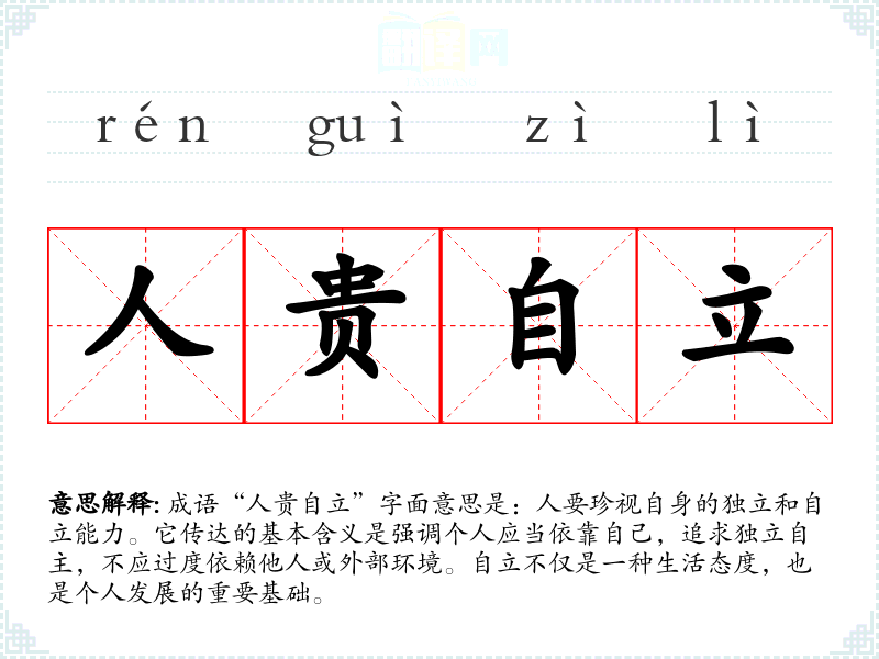 | 人贵自立 | 贵:可贵;自立:独立。一个人可贵之处是能够独立生活,不依靠别人。 |