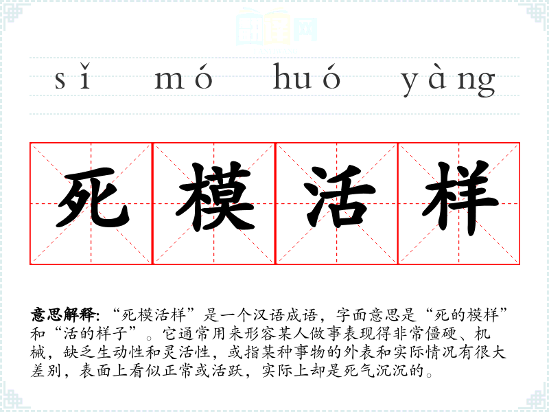 “死模活样”是一个汉语成语,字面意思是“死的模样”和“活的样子”。它通常用来形容某人做事表现得非常僵硬、机械,缺乏生动性和灵活性,或指某种事物的外表和实际情况有很大差别,表面上看似正常或活跃,实际上却是死气沉沉的。