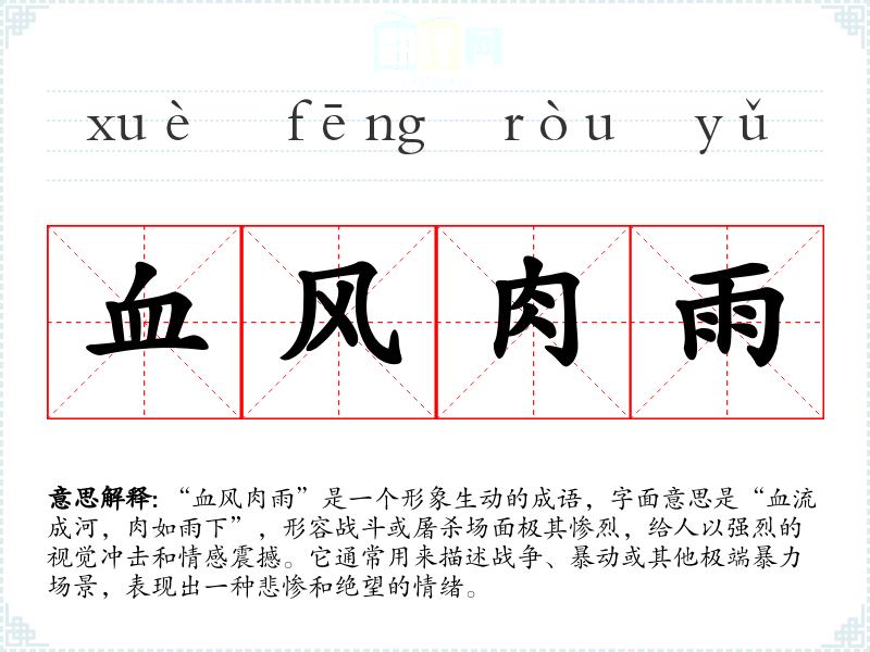 “血风肉雨”最早出现在明代文人冯梦龙的《东周列国志》中,描绘了战斗中的惨烈情景。成语所描绘的场景反映了历史上多次战争或屠杀,尤其是在古代历史中,许多朝代更迭、王朝兴亡的过程中,常常伴随着极大的流血与暴力,因此这一成语也带有深厚的历史文化背景。