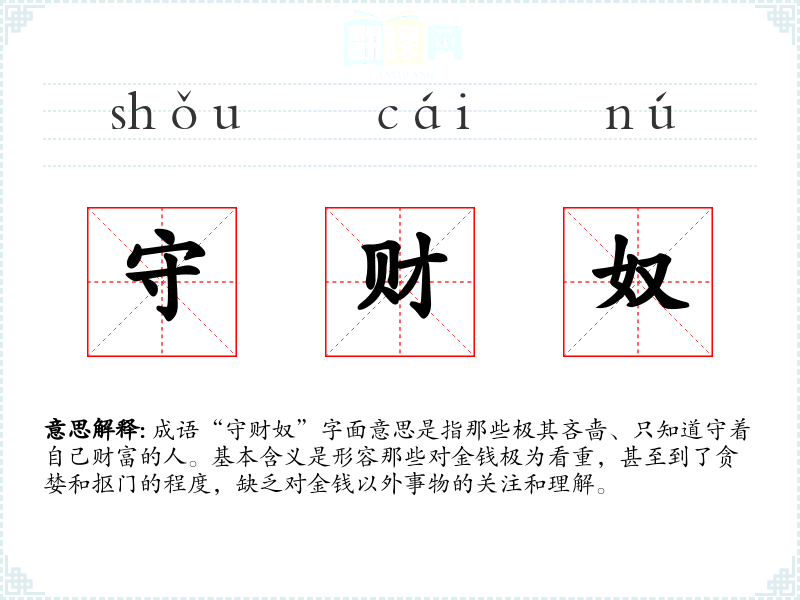 成语“守财奴”字面意思是指那些极其吝啬、只知道守着自己财富的人。基本含义是形容那些对金钱极为看重,甚至到了贪婪和抠门的程度,缺乏对金钱以外事物的关注和理解。