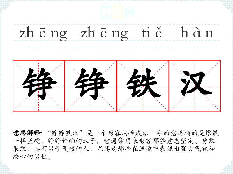“铮铮铁汉”是一个形容词性成语,字面意思指的是像铁一样坚硬、铮铮作响的汉子。它通常用来形容那些意志坚定、勇敢果敢、具有男子气概的人,尤其是那些在逆境中表现出强大气魄和决心的男性。
