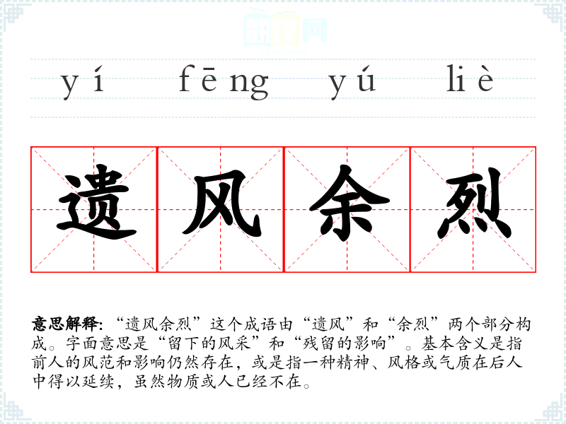“遗风余烈”这个成语由“遗风”和“余烈”两个部分构成。字面意思是“留下的风采”和“残留的影响”。基本含义是指前人的风范和影响仍然存在,或是指一种精神、风格或气质在后人中得以延续,虽然物质或人已经不在。