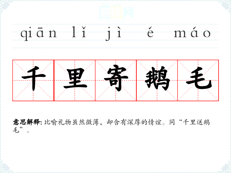 比喻礼物虽然微薄,却含有深厚的情谊。同“千里送鹅毛”。 |