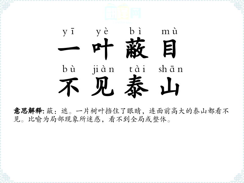 蔽:遮。一片树叶挡住了眼睛,连面前高大的泰山都看不见。比喻为局部现象所迷惑,看不到全局或整体。 |