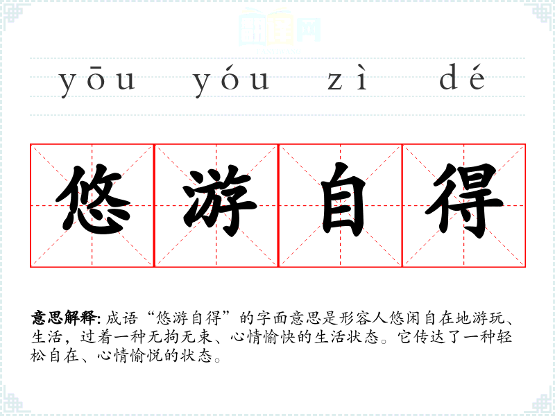 成语“悠游自得”的字面意思是形容人悠闲自在地游玩、生活,过着一种无拘无束、心情愉快的生活状态。它传达了一种轻松自在、心情愉悦的状态。