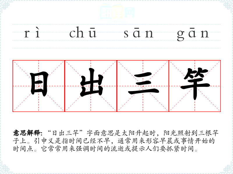 “日出三竿”字面意思是太阳升起时,阳光照射到三根竿子上。引申义是指时间已经不早,通常用来形容早晨或事情开始的时间点。它常常用来强调时间的流逝或提示人们要抓紧时间。