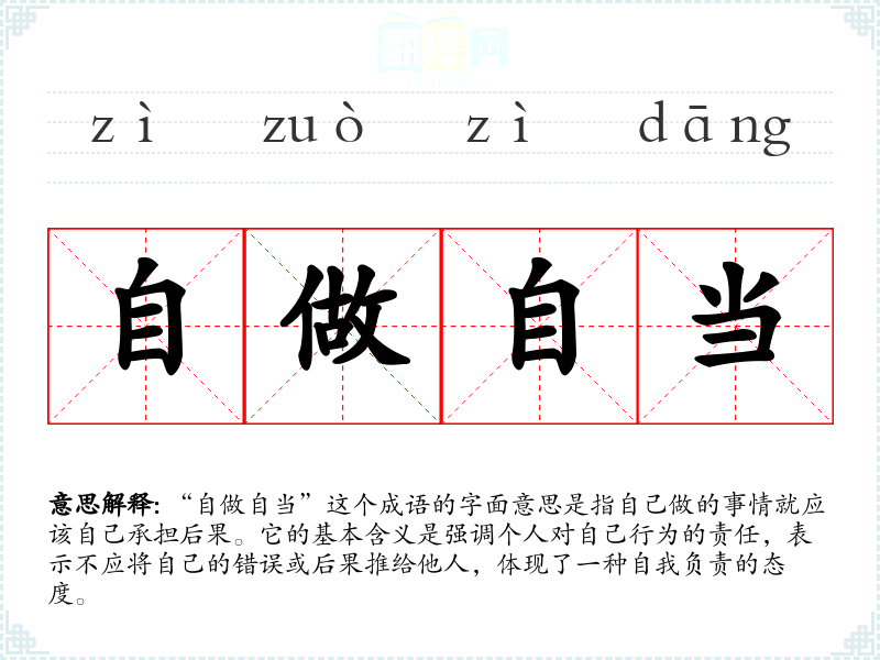 “自做自当”这个成语的字面意思是指自己做的事情就应该自己承担后果。它的基本含义是强调个人对自己行为的责任,表示不应将自己的错误或后果推给他人,体现了一种自我负责的态度。