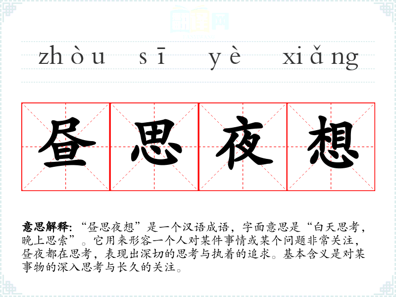 “昼思夜想”是一个汉语成语,字面意思是“白天思考,晚上思索”。它用来形容一个人对某件事情或某个问题非常关注,昼夜都在思考,表现出深切的思考与执着的追求。基本含义是对某事物的深入思考与长久的关注。