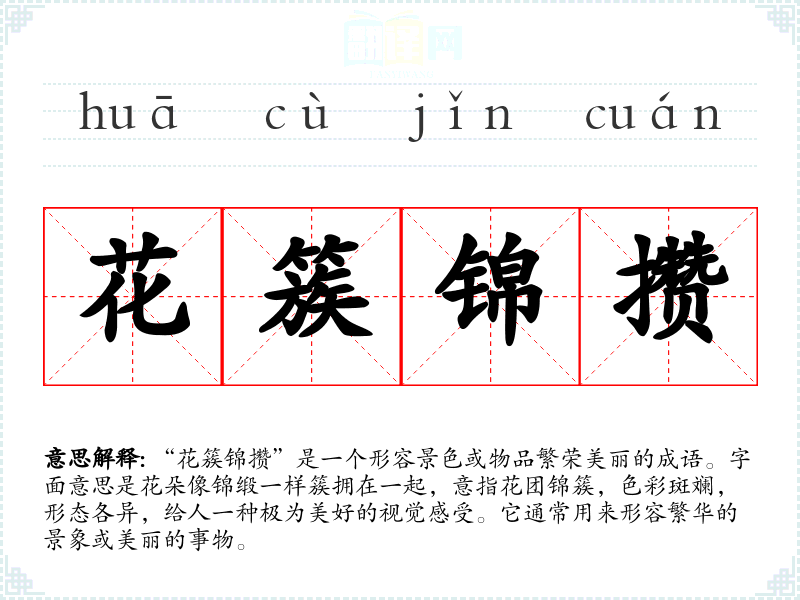 “花簇锦攒”让人联想到春天的生机与活力,仿佛能感受到花香四溢和温暖的阳光,带给人愉悦的感受。它鼓励人们欣赏生活中的美好事物,激励人们追求多姿多彩的生活。