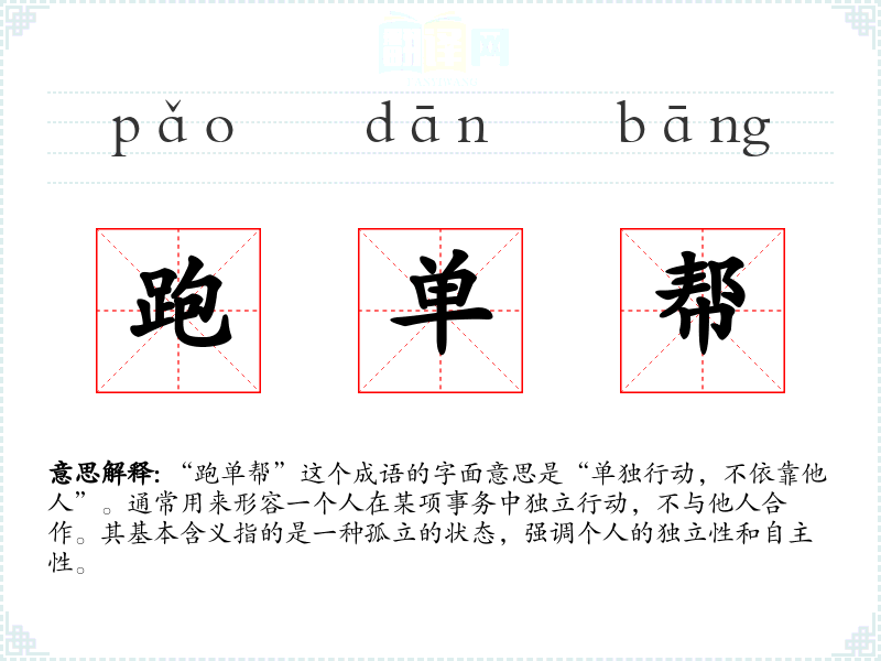 “跑单帮”这个成语的字面意思是“单独行动,不依靠他人”。通常用来形容一个人在某项事务中独立行动,不与他人合作。其基本含义指的是一种孤立的状态,强调个人的独立性和自主性。