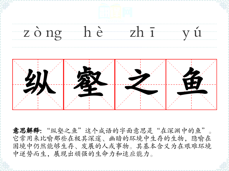 “纵壑之鱼”这个成语的字面意思是“在深渊中的鱼”。它常用来比喻那些在极其深邃、幽暗的环境中生存的生物,隐喻在困境中仍然能够生存、发展的人或事物。其基本含义为在艰难环境中逆势而生,展现出顽强的生命力和适应能力。