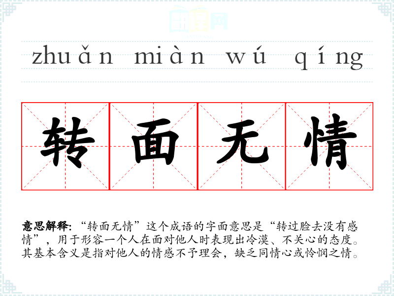 “转面无情”这个成语的字面意思是“转过脸去没有感情”,用于形容一个人在面对他人时表现出冷漠、不关心的态度。其基本含义是指对他人的情感不予理会,缺乏同情心或怜悯之情。