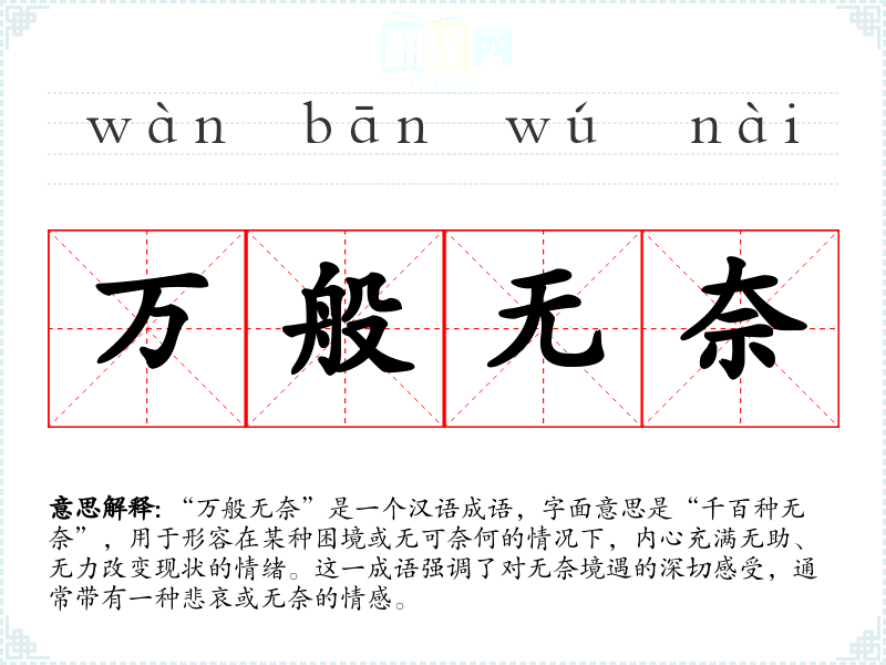 “万般无奈”是一个汉语成语,字面意思是“千百种无奈”,用于形容在某种困境或无可奈何的情况下,内心充满无助、无力改变现状的情绪。这一成语强调了对无奈境遇的深切感受,通常带有一种悲哀或无奈的情感。