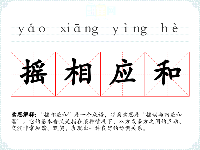 “摇相应和”是一个成语,字面意思是“摇动与回应和谐”。它的基本含义是指在某种情况下,双方或多方之间的互动、交流非常和谐、默契,表现出一种良好的协调关系。