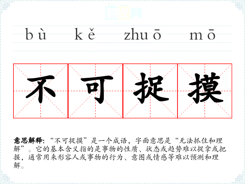 “不可捉摸”是一个成语,字面意思是“无法抓住和理解”。它的基本含义指的是事物的性质、状态或趋势难以捉拿或把握,通常用来形容人或事物的行为、意图或情感等难以预测和理解。