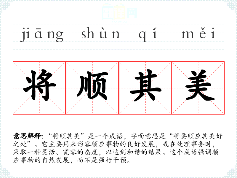 “将顺其美”是一个成语,字面意思是“将要顺应其美好之处”。它主要用来形容顺应事物的良好发展,或在处理事务时,采取一种灵活、宽容的态度,以达到和谐的结果。这个成语强调顺应事物的自然发展,而不是强行干预。