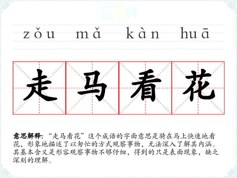 “走马看花”这个成语的字面意思是骑在马上快速地看花,形象地描述了以匆忙的方式观察事物,无法深入了解其内涵。其基本含义是形容观察事物不够仔细,得到的只是表面现象,缺乏深刻的理解。