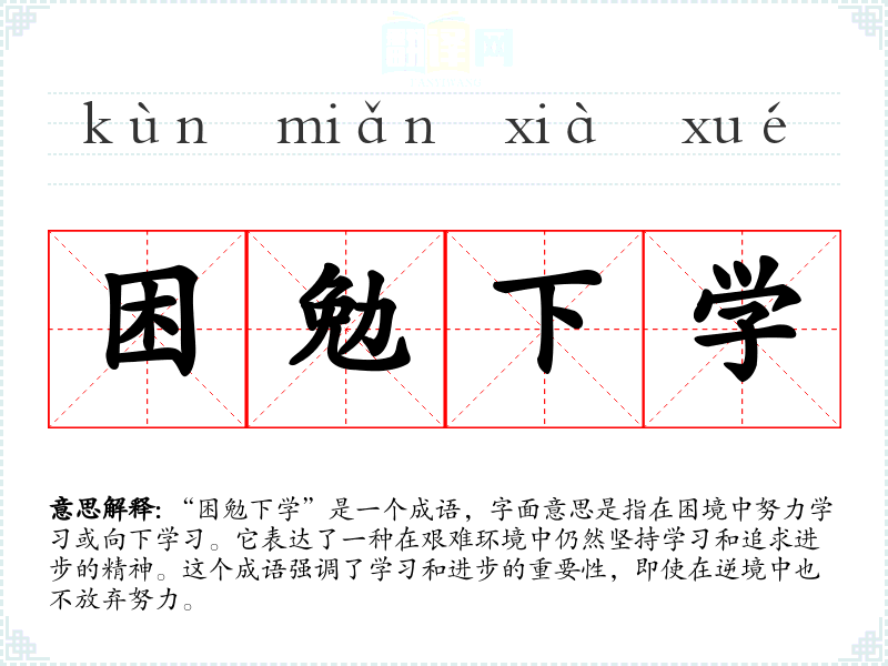 “困勉下学”是一个成语,字面意思是指在困境中努力学或向下学。它表达了一种在艰难环境中仍然坚持学和追求进步的精神。这个成语强调了学和进步的重要性,即使在逆境中也不放弃努力。