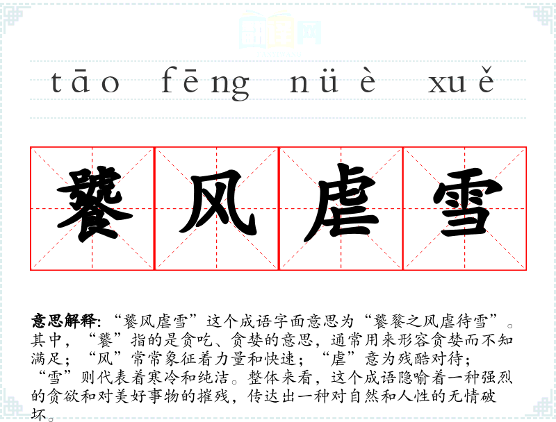 “饕风虐雪”这个成语字面意思为“饕餮之风虐待雪”。其中,“饕”指的是贪吃、贪婪的意思,通常用来形容贪婪而不知满足;“风”常常象征着力量和快速;“虐”意为残酷对待;“雪”则代表着寒冷和纯洁。整体来看,这个成语隐喻着一种强烈的贪欲和对美好事物的摧残,传达出一种对自然和人性的无情破坏。
