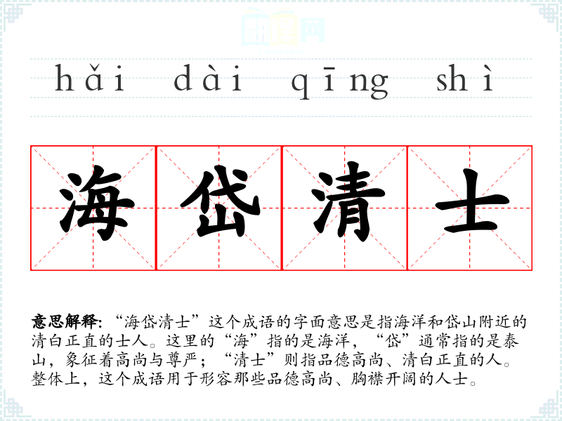 “海岱清士”这个成语的字面意思是指海洋和岱山附近的清白正直的士人。这里的“海”指的是海洋,“岱”通常指的是泰山,象征着高尚与尊严;“清士”则指品德高尚、清白正直的人。整体上,这个成语用于形容那些品德高尚、胸襟开阔的人士。