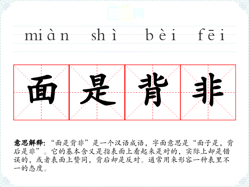 “面是背非”是一个汉语成语,字面意思是“面子是,背后是非”。它的基本含义是指表面上看起来是对的,实际上却是错误的,或者表面上赞同,背后却是反对。通常用来形容一种表里不一的态度。