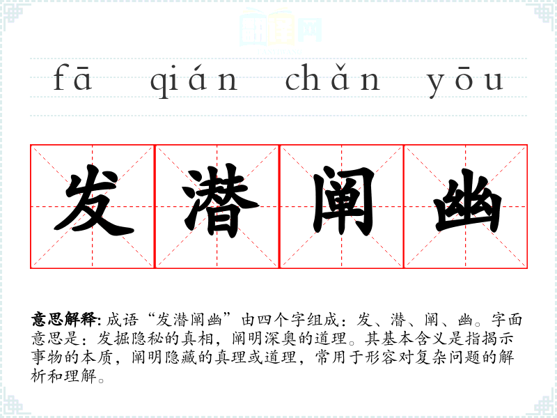 成语“发潜阐幽”由四个字组成:发、潜、阐、幽。字面意思是:发掘隐秘的真相,阐明深奥的道理。其基本含义是指揭示事物的本质,阐明隐藏的真理或道理,常用于形容对复杂问题的解析和理解。