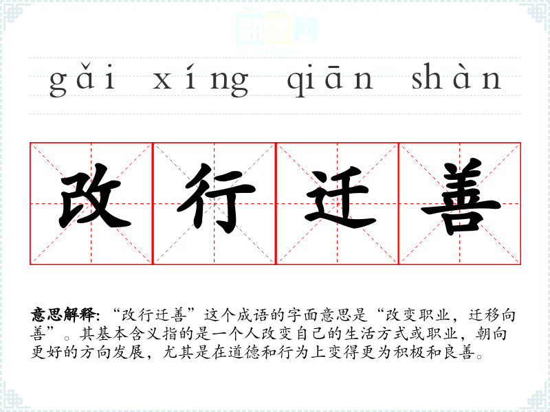 “改行迁善”这个成语的字面意思是“改变职业,迁移向善”。其基本含义指的是一个人改变自己的生活方式或职业,朝向更好的方向发展,尤其是在道德和行为上变得更为积极和良善。