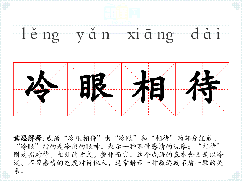 成语“冷眼相待”由“冷眼”和“相待”两部分组成。“冷眼”指的是冷淡的眼神,表示一种不带感情的观察;“相待”则是指对待、相处的方式。整体而言,这个成语的基本含义是以冷淡、不带感情的态度对待他人,通常暗示一种疏远或不屑一顾的关系。