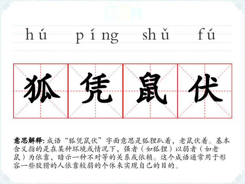 成语“狐凭鼠伏”字面意思是狐狸趴着,老鼠伏着。基本含义指的是在某种环境或情况下,强者(如狐狸)以弱者(如老鼠)为依靠,暗示一种不对等的关系或依赖。这个成语通常用于形容一些狡猾的人依靠较弱的个体来实现自己的目的。