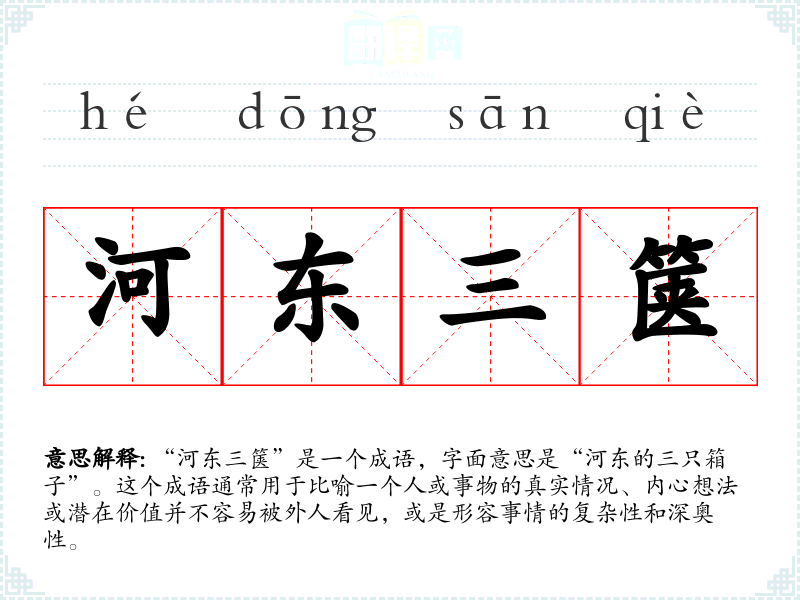“河东三箧”是一个成语,字面意思是“河东的三只箱子”。这个成语通常用于比喻一个人或事物的真实情况、内心想法或潜在价值并不容易被外人看见,或是形容事情的复杂性和深奥性。