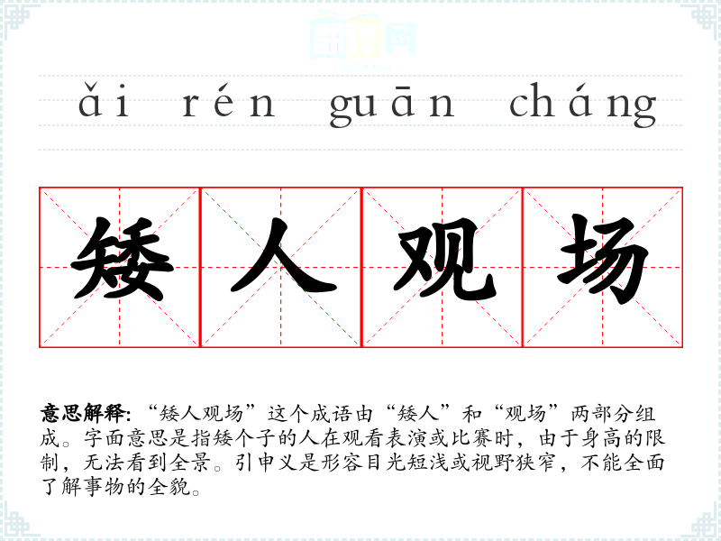 “矮人观场”这个成语由“矮人”和“观场”两部分组成。字面意思是指矮个子的人在观看表演或比赛时,由于身高的限制,无法看到全景。引申义是形容目光短浅或视野狭窄,不能全面了解事物的全貌。