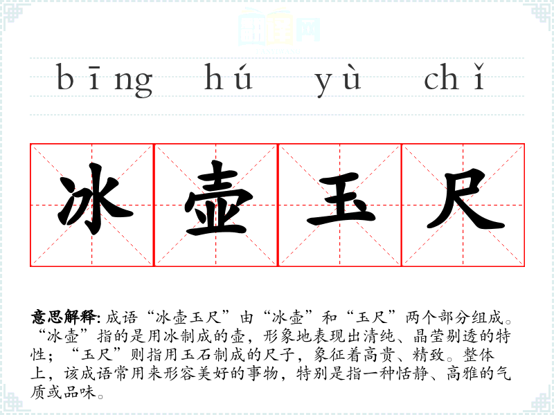 成语“冰壶玉尺”由“冰壶”和“玉尺”两个部分组成。“冰壶”指的是用冰制成的壶,形象地表现出清纯、晶莹剔透的特性;“玉尺”则指用玉石制成的尺子,象征着高贵、精致。整体上,该成语常用来形容美好的事物,特别是指一种恬静、高雅的气质或品味。