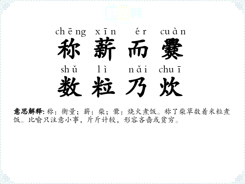 称:衡量;薪:柴;爨:烧火煮饭。称了柴草数着米粒煮饭。比喻只注意小事,斤斤计较,形容吝啬或贫穷。 |