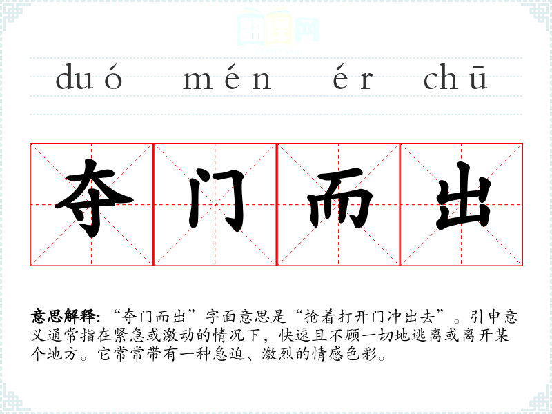 “夺门而出”字面意思是“抢着打开门冲出去”。引申意义通常指在紧急或激动的情况下,快速且不顾一切地逃离或离开某个地方。它常常带有一种急迫、激烈的情感色彩。
