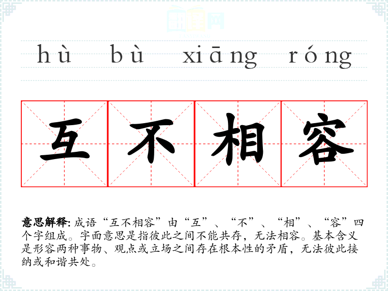 成语“互不相容”由“互”、“不”、“相”、“容”四个字组成。字面意思是指彼此之间不能共存,无法相容。基本含义是形容两种事物、观点或立场之间存在根本性的矛盾,无法彼此接纳或和谐共处。